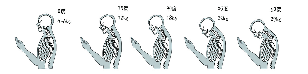 アメリカ・ニューヨークの脊椎外科医 ケネス・ハンスラージ氏の研究に、頭を前方に傾けることによる首が支える重さについて、以下の数値を出しています。