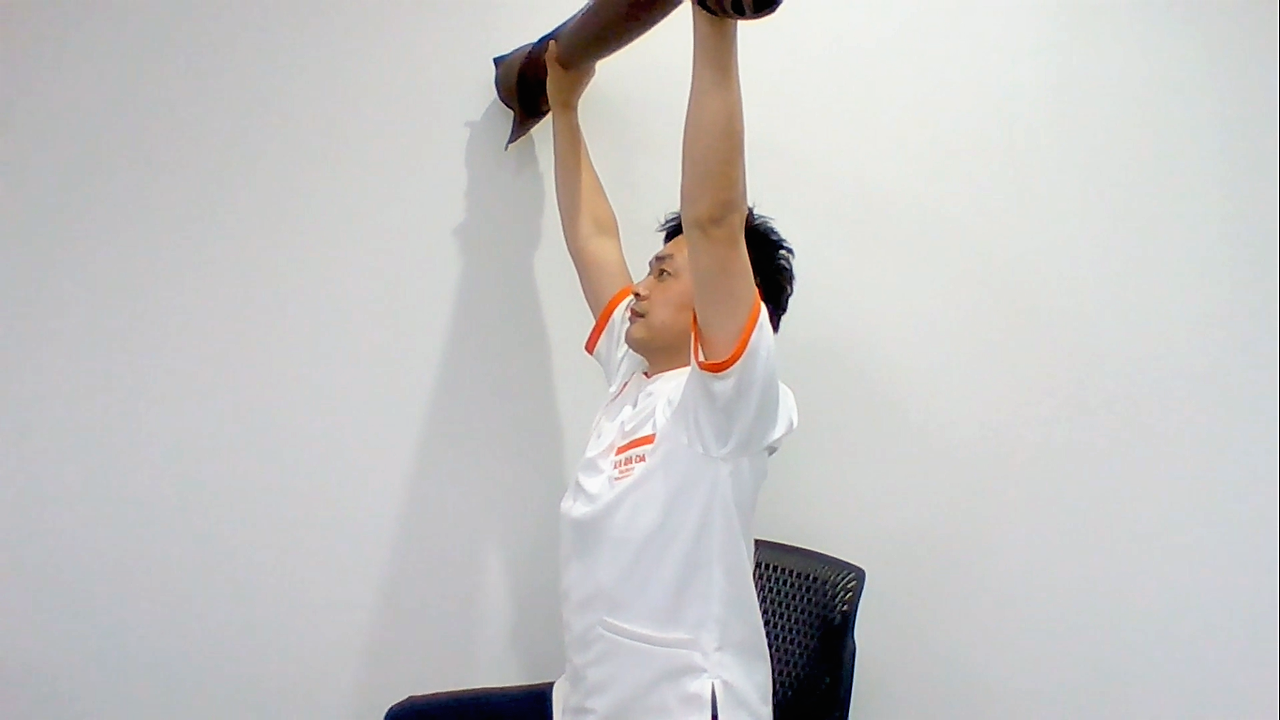 4.再び、息を吸いながら両手を挙げ、肩を耳に近づける。