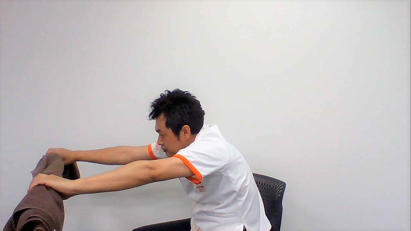 1.座った姿勢で、足を腰幅に開き、タオルを持つ。