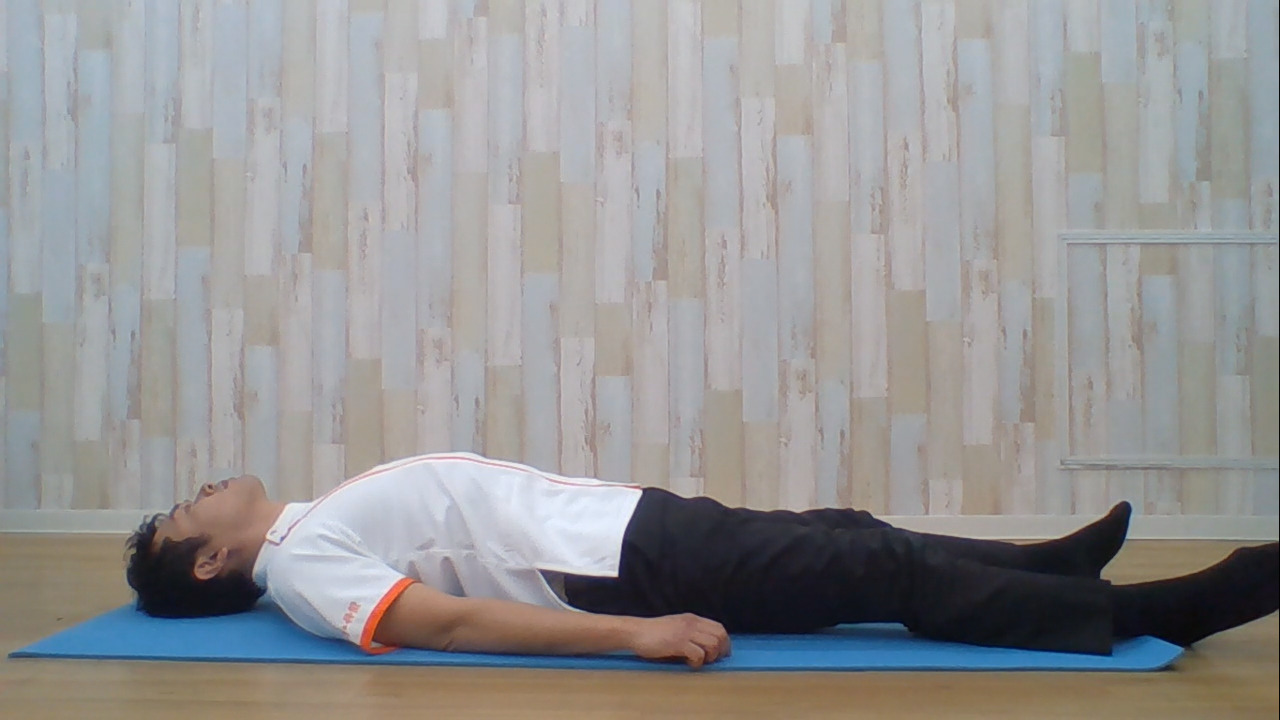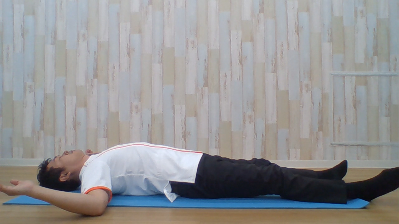 4.手のひらを上にして体側に置き、目を閉じて深呼吸を10回行う。