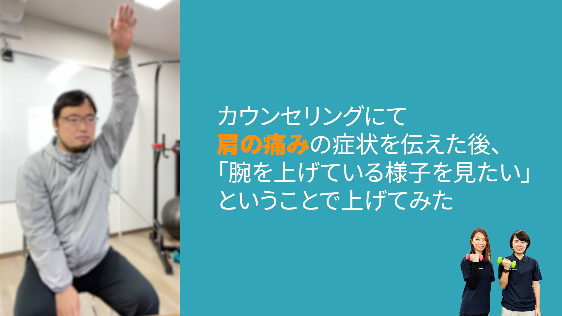 カウンセリングで肩の痛みの症状を伝えると「腕を上げ下げしている様子を見たい」と言われたので、やってみました。この「腕の上げ下げ」の検査で、どこに痛みの理由があるのかおおよそわかるのだそう。正面や側面から、何種類か異なる腕の上げ下げを見せました。