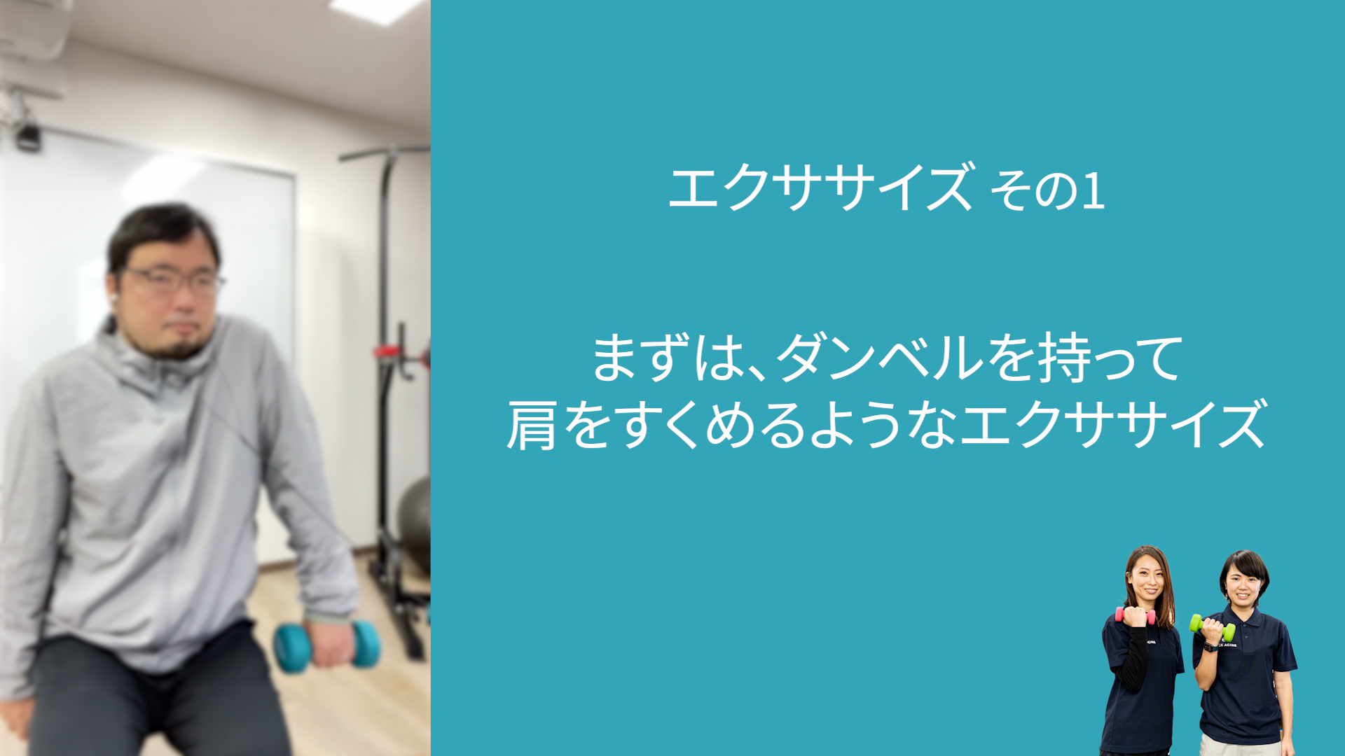 検査のあと、2種類のエクササイズを提案されました。治療前と治療後で変化がわかりやすいように左側だけ行ないます。ひとつめはダンベルを持って肩をすくめるようなエクササイズ。肩を耳につけるように上げたまま「1、2」と数え、「3」で下ろすサイクルを10回×3セット行ないます。筋トレではないのでキツくなく、むしろ普段動かさない部位を動かせた心地よさが味わえました。
