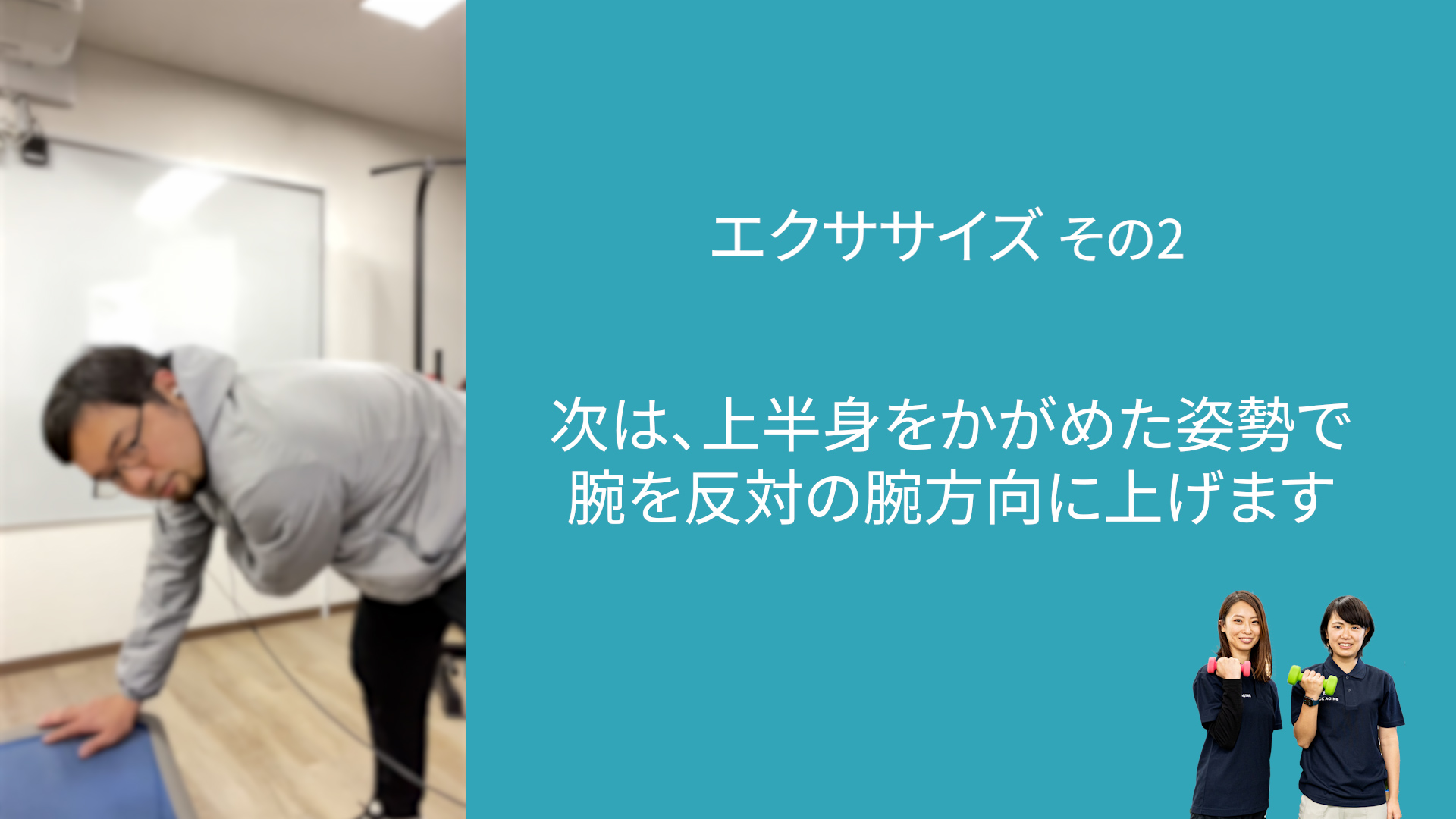 ふたつめは上半身をかがめた姿勢で、左腕を右腕方向に上げるエクササイズです。こちらも「1、2」で上げて「3」で下ろすリズムで10回×3セット行ないました。腕の上部がひっかかる感覚があり、体の硬さを改めて思い知らされることに。