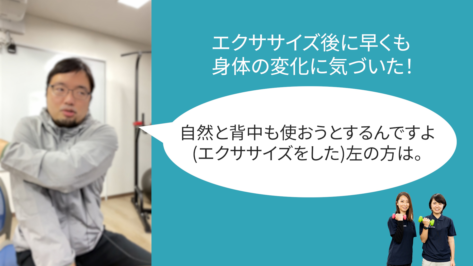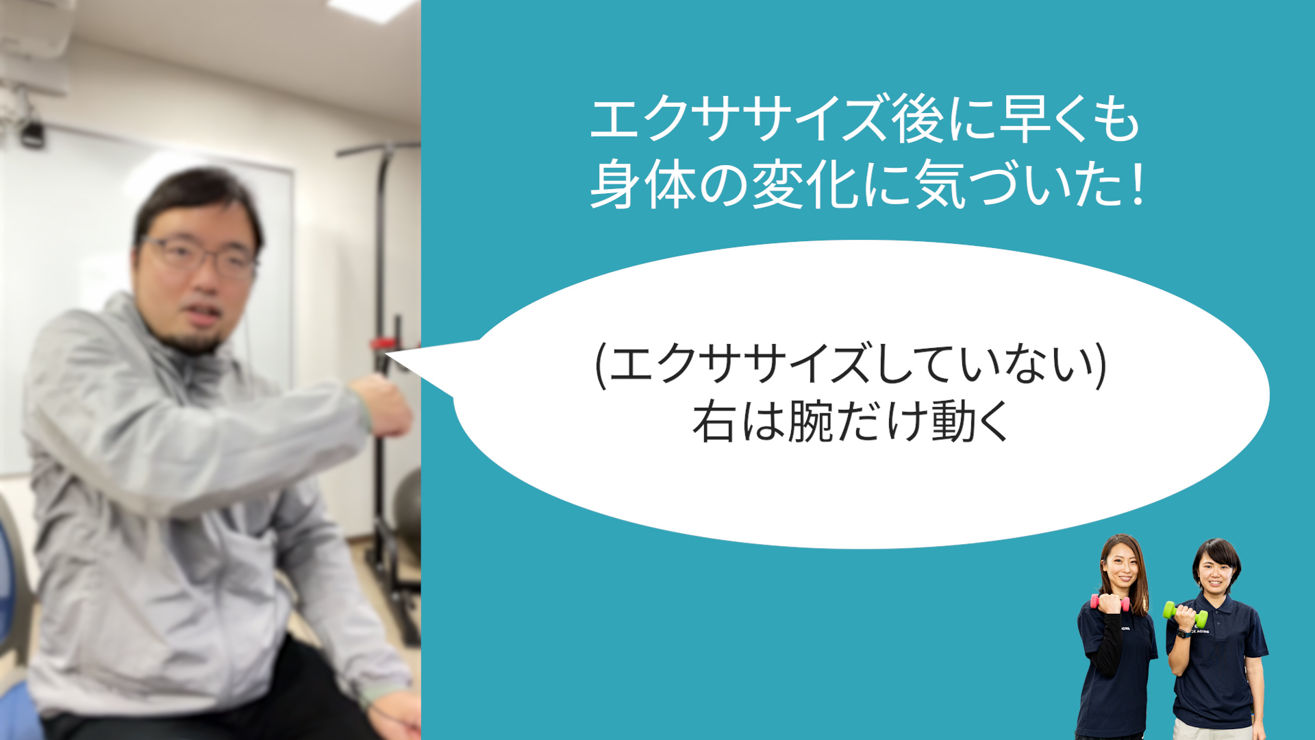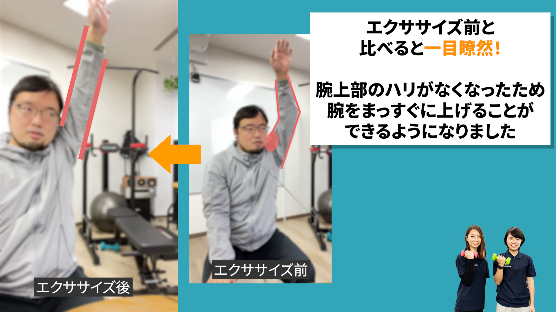 腕を上にあげる動作もエクササイズ前と比べて一目瞭然。上腕部にひっかかる感覚があったためうまく腕が上がらなかったのが、まっすぐ上げることができるようになりました。ただこの効果は一時的で、数日や短い人だと半日ほどで元に戻ってしまうそうです。僕もそうでした。