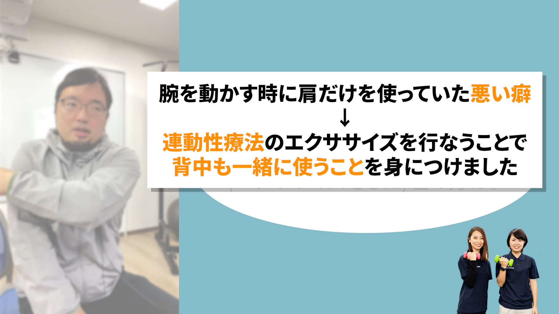 腕の上げ方をチェックし、痛みの症状に適したエクササイズを行うことで、普段の生活であまり使っていなかった筋肉を呼び覚まし、腕、肩、背中が連動するようになったのです。これで肩にかかっていた負担が軽減されるのだそう。
